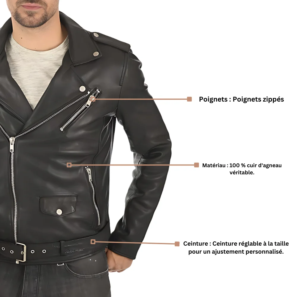 Redéfinissez l’élégance robuste avec notre veste de moto en cuir noire avec ceinture pour hommes. Fabriquée de main de maître à partir du cuir véritable le plus fin, cette veste incarne l’esprit de la route avec ses éléments de design moto classiques. L’ajout d’une ceinture distinctive ajoute à la fois de la fonctionnalité et une touche de style unique. Parfait pour l’homme moderne qui recherche à parts égales l’aventure et la classe.
